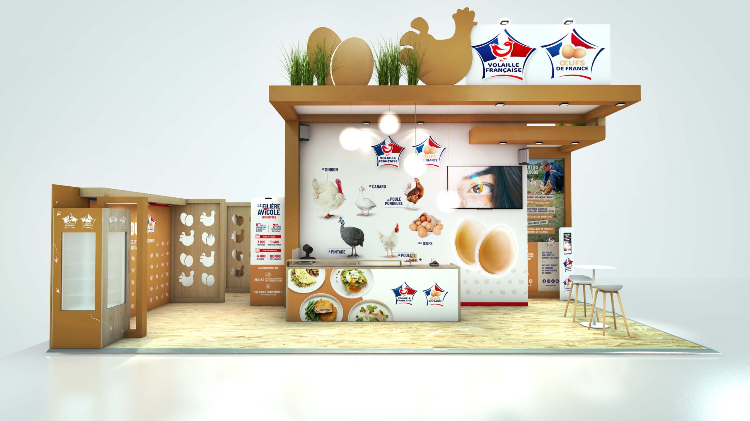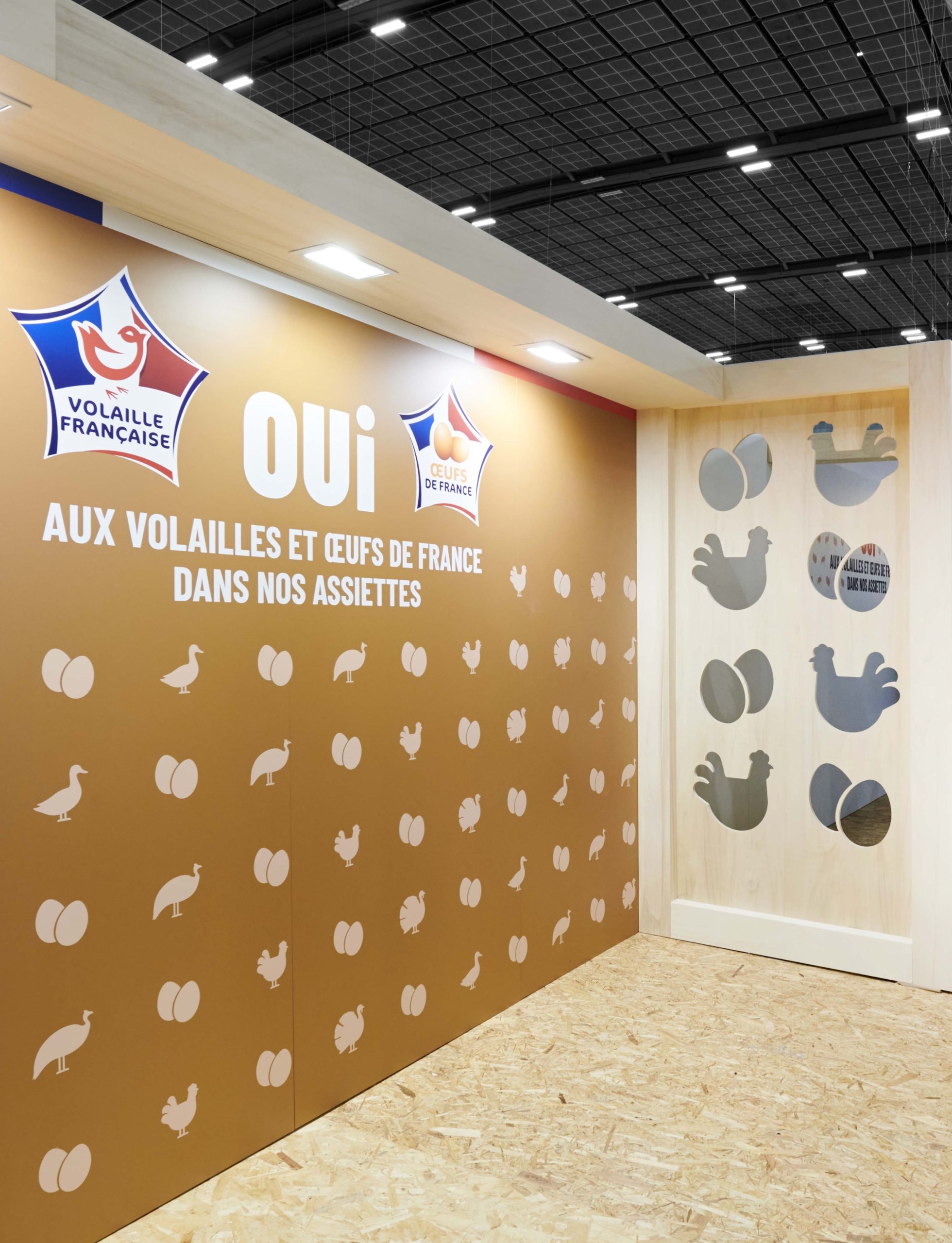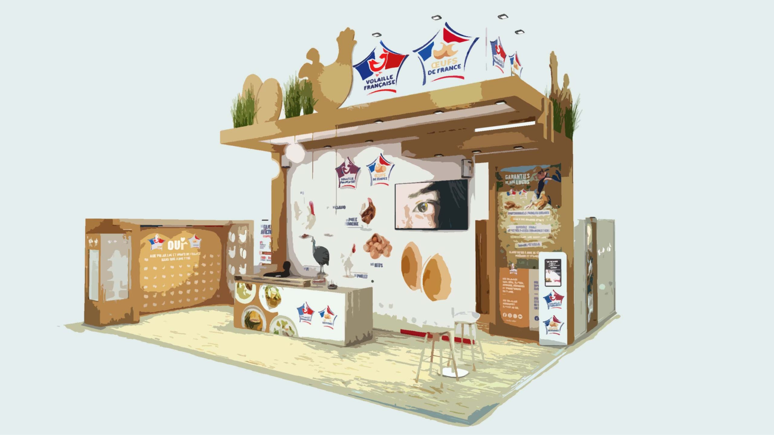 Le stand Volaille Française est pensé comme une vitrine pédagogique de la filière avicole, où chaque élément de l’architecture contribue à rendre le message lisible et accessible.