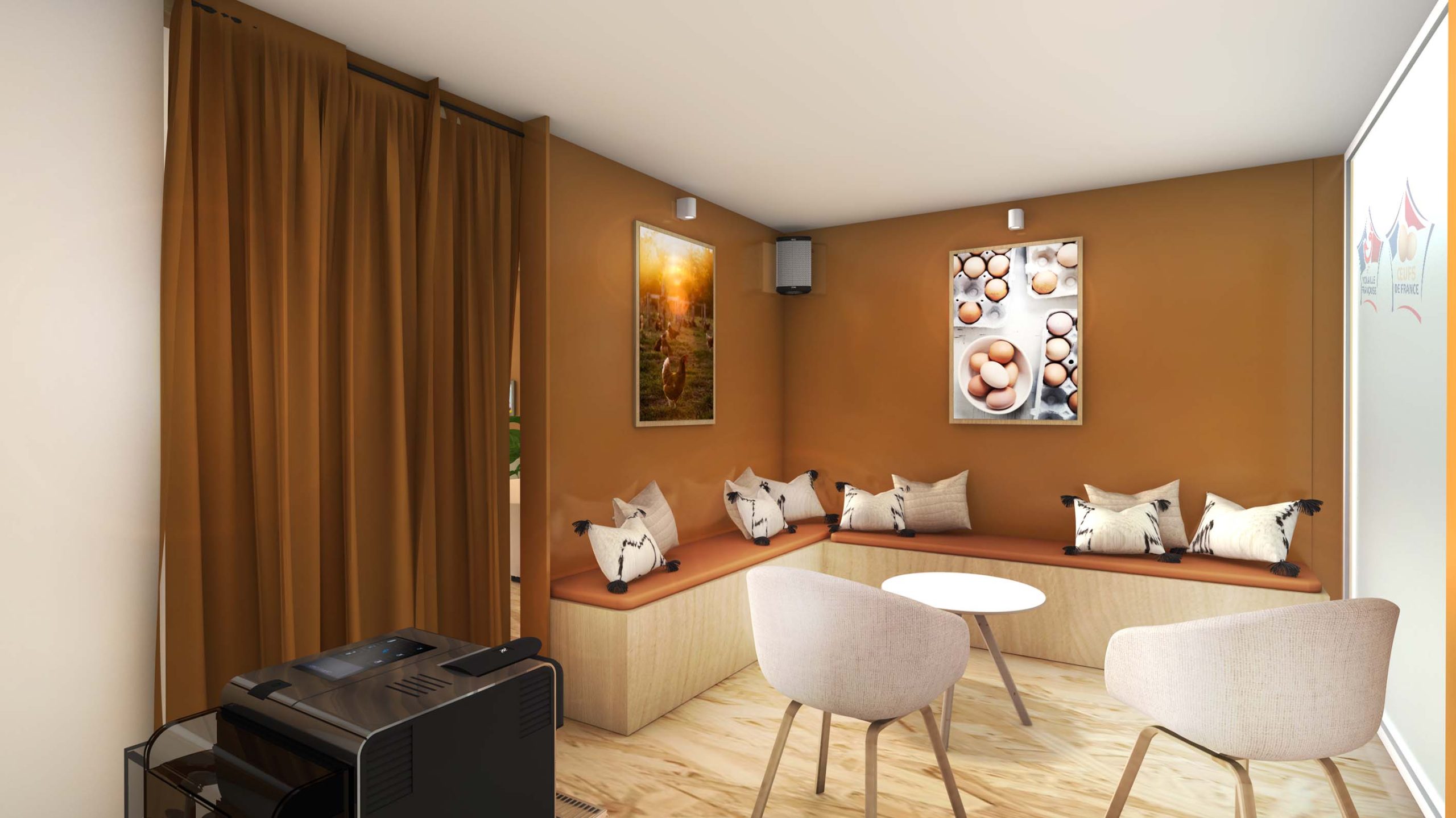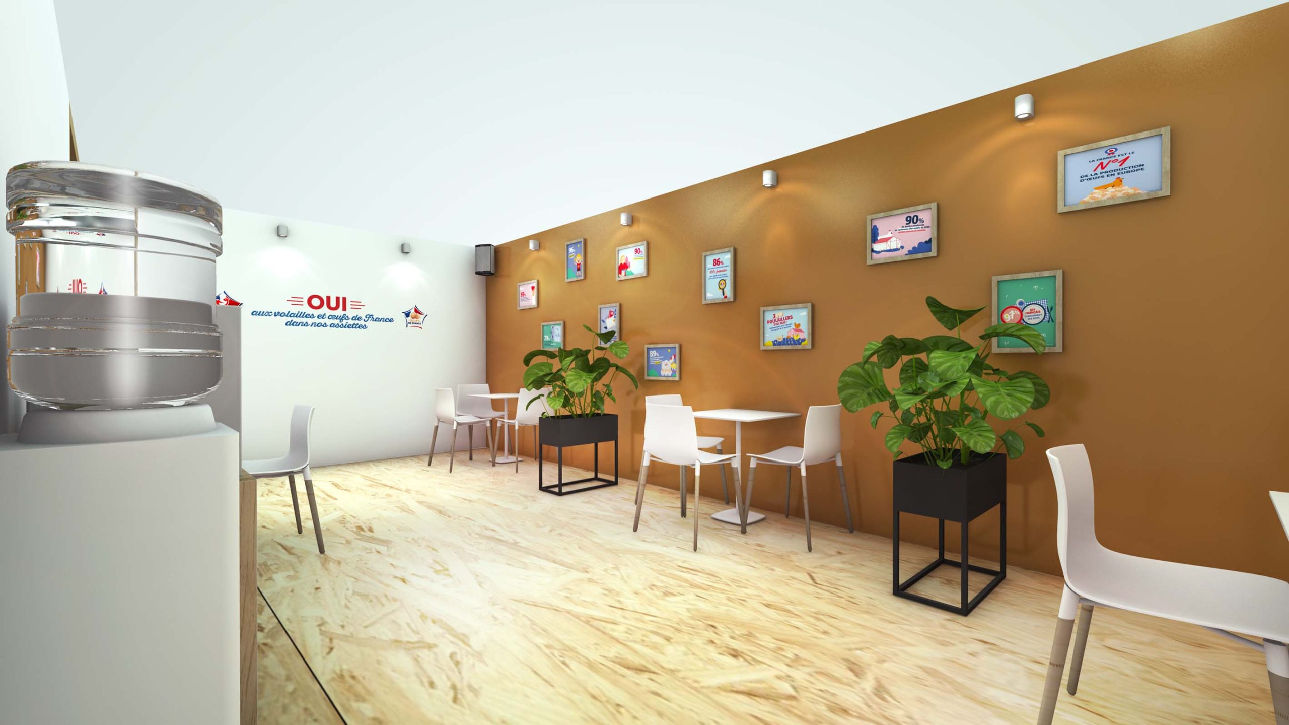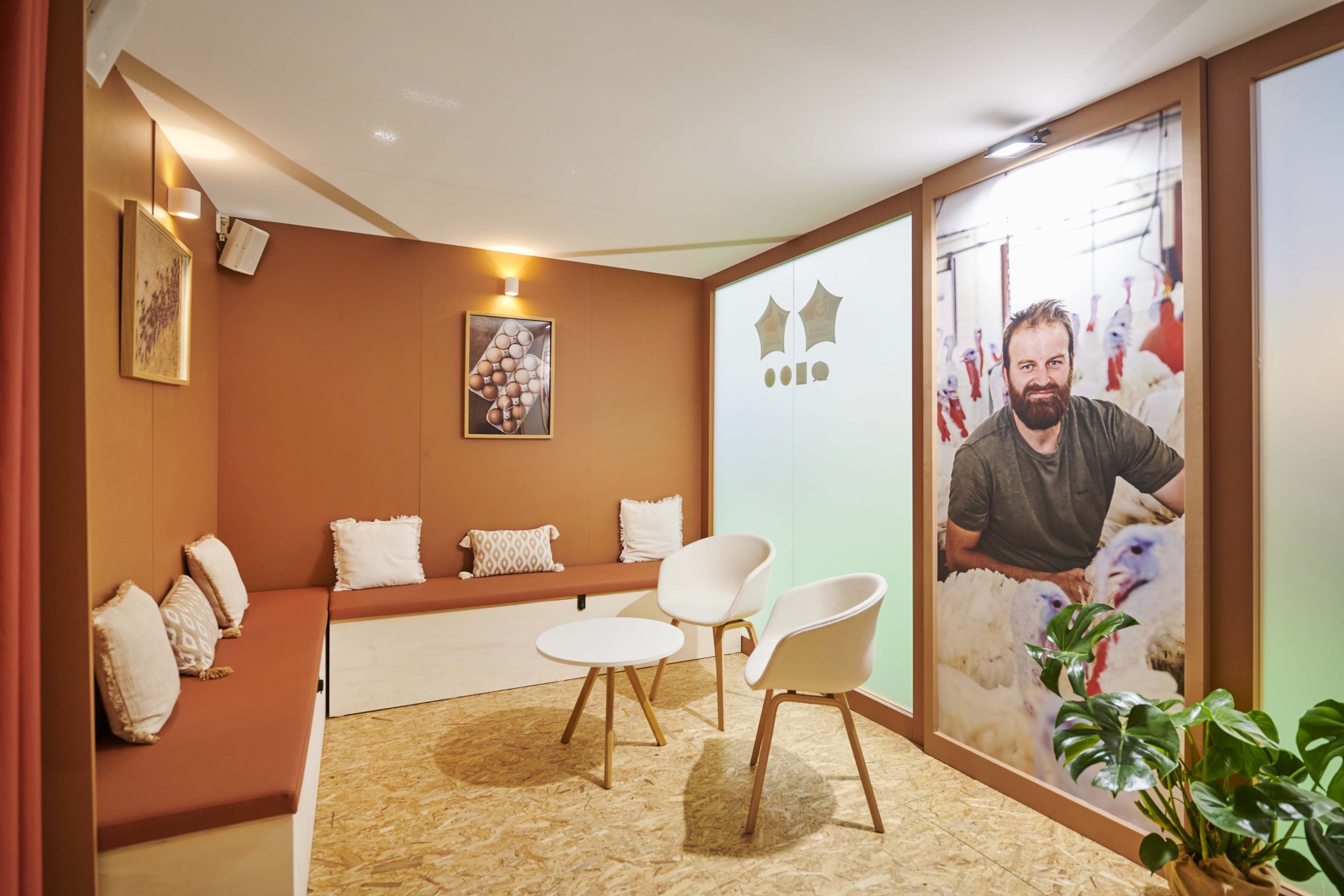 Le stand Volaille Française est pensé comme une vitrine pédagogique de la filière avicole, où chaque élément de l’architecture contribue à rendre le message lisible et accessible.