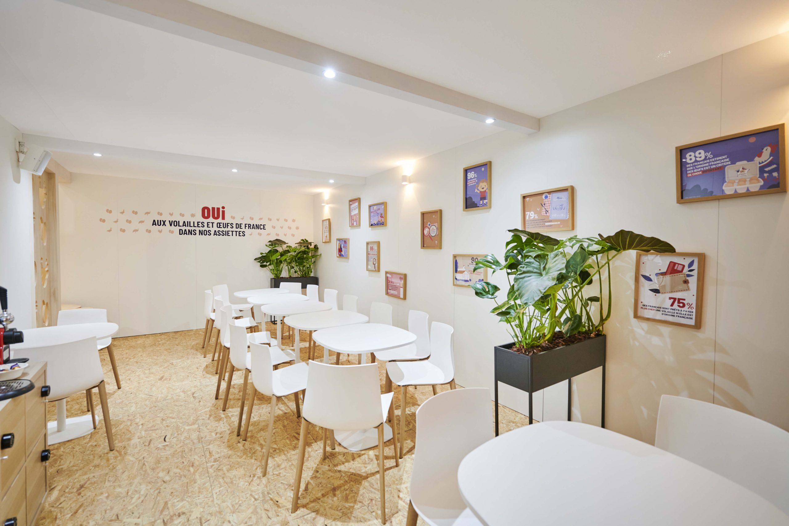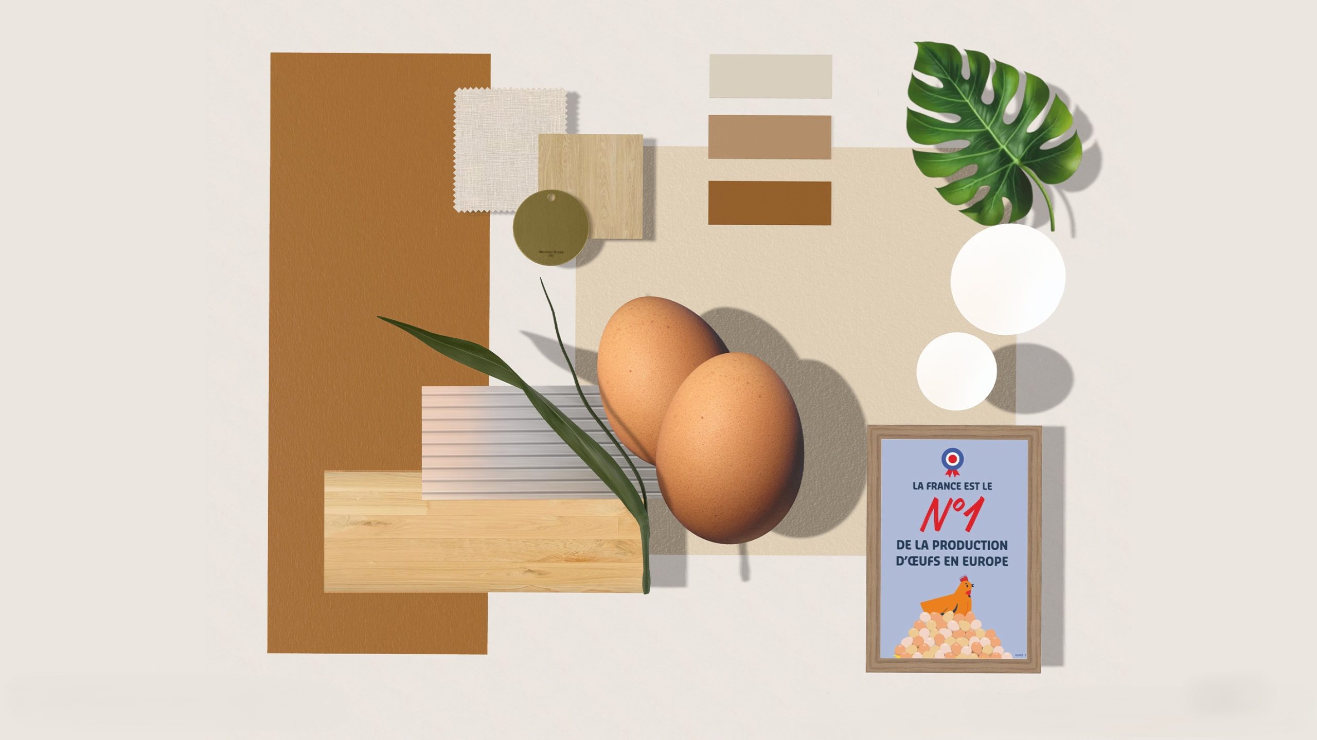 La structure horizontale, surmontée de silhouettes monumentales de poule et d’œufs, crée un repère visuel fort dans le salon tout en affirmant l’identité du stand.